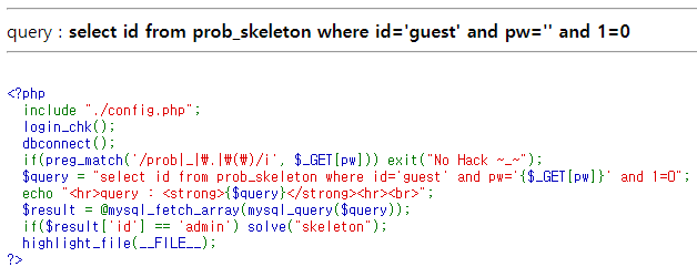 query를 id='guest' and pw=$_GET[pw] and 1=0으로